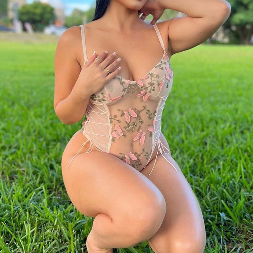 Women's Fashionable See-through Mesh Embroidery Drawstring Jumpsuit